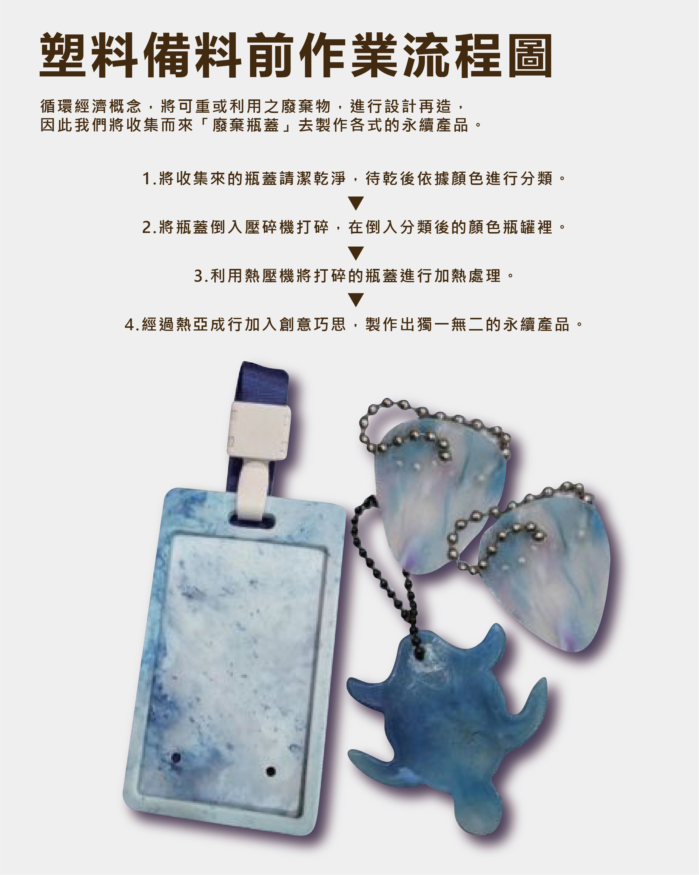 每一件證件套皆嚴選收集而來的廢棄瓶蓋,交由在地長者細心清潔與顏色分類,賦予長者成就感與收入。